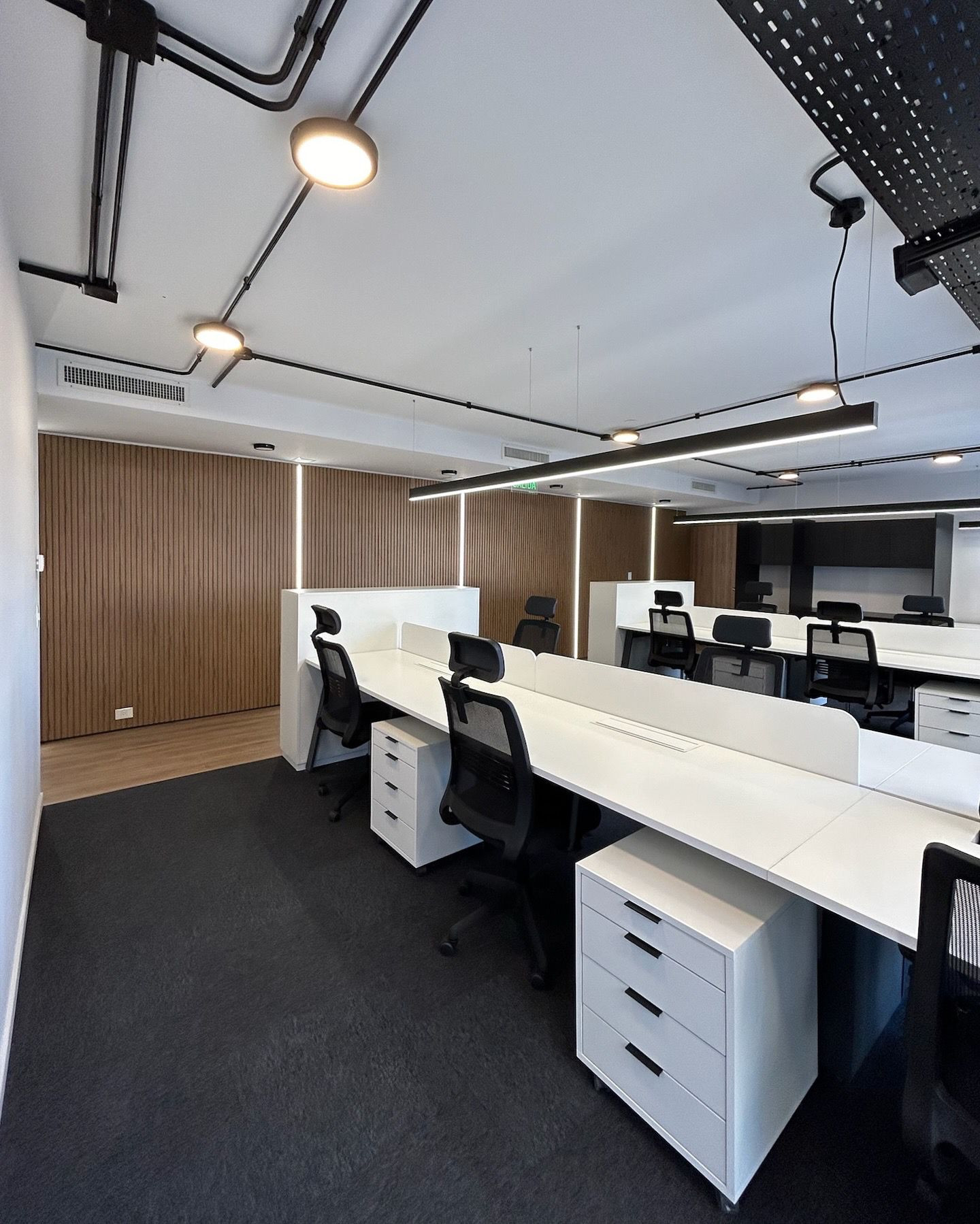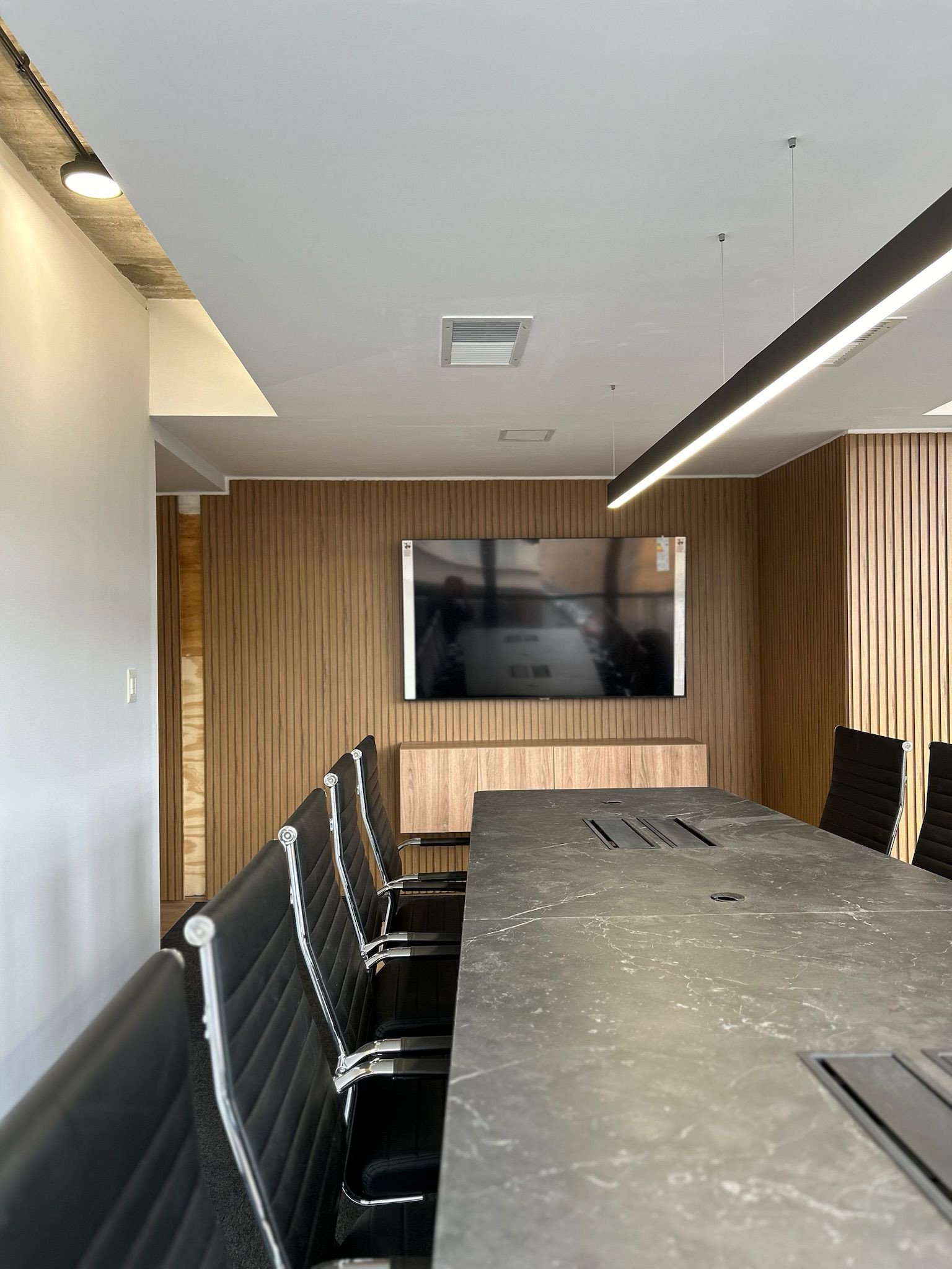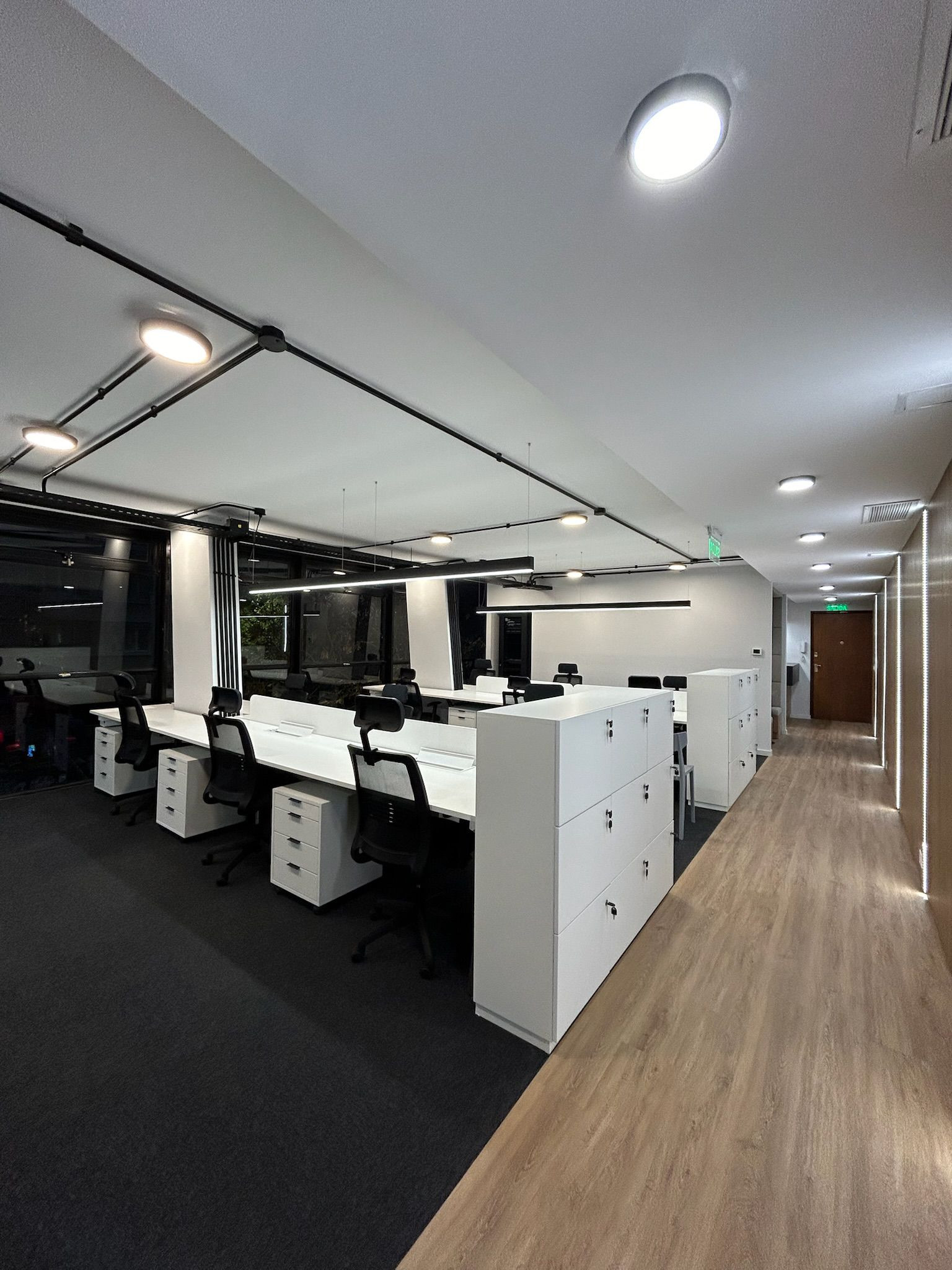 En 120 m2 pudimos proyectar un espacio de recepción, meeting box, coffee, sala de rack, islas de trabajo 12pax y una sala de reuniones 10pax.