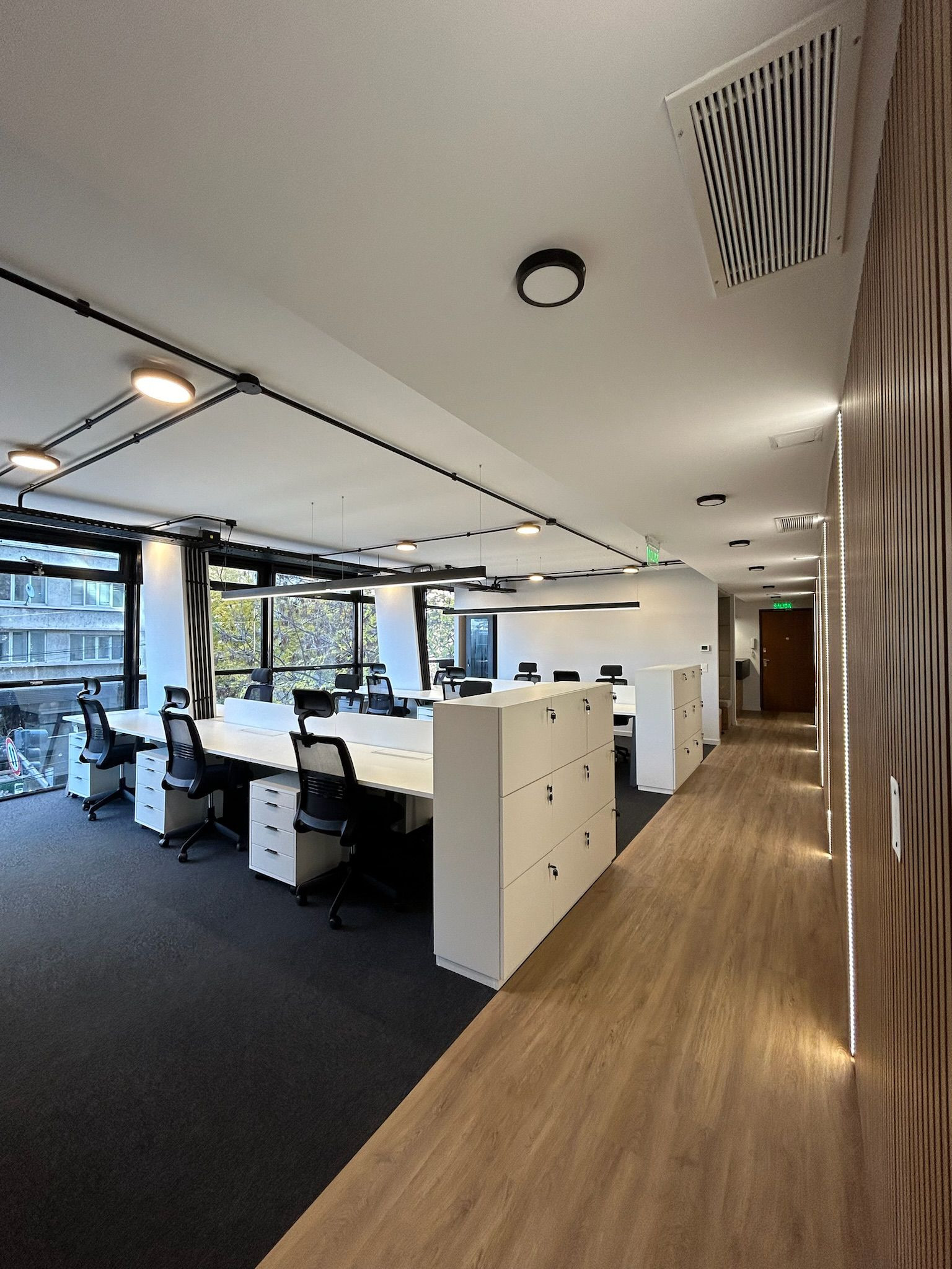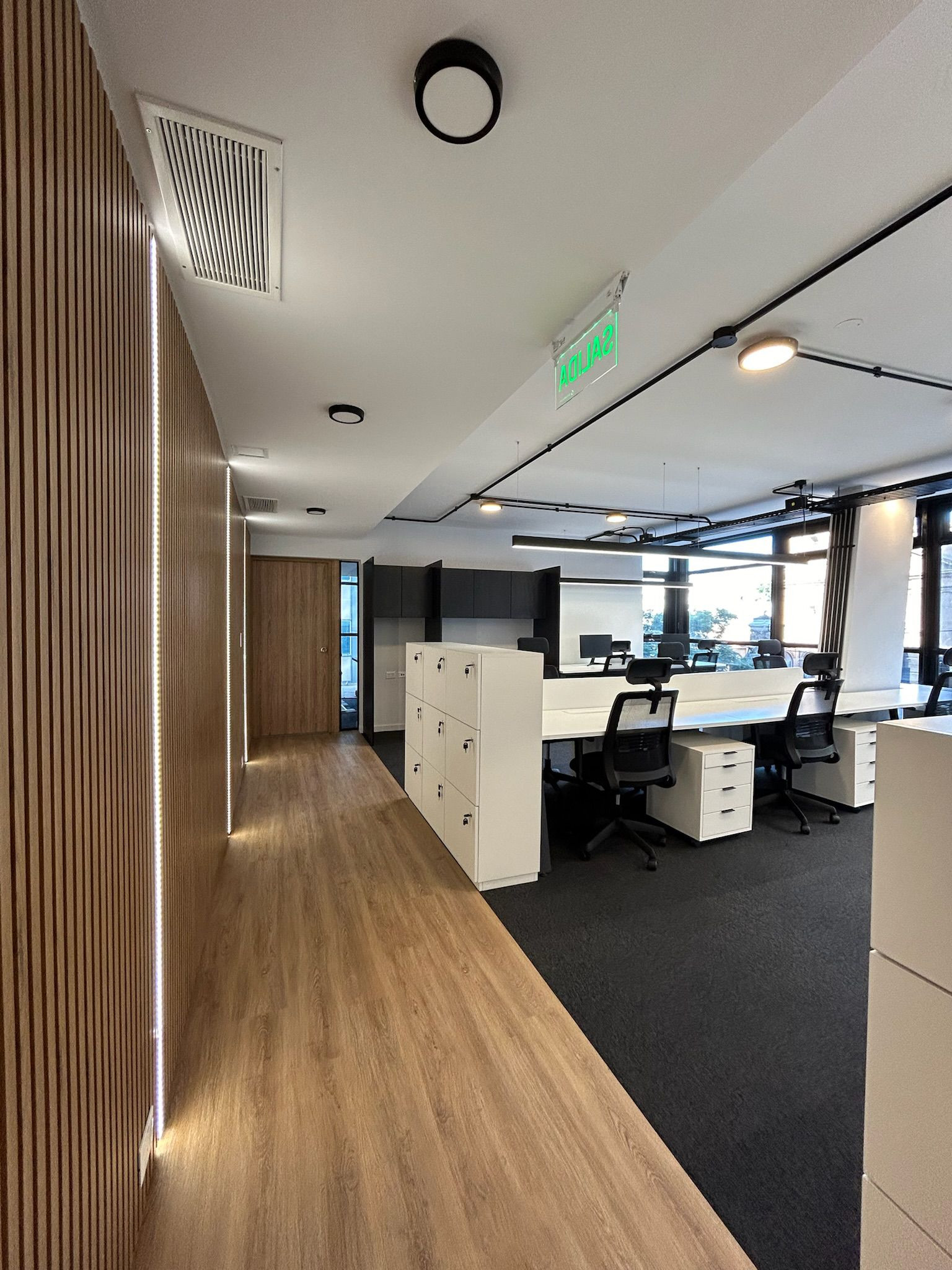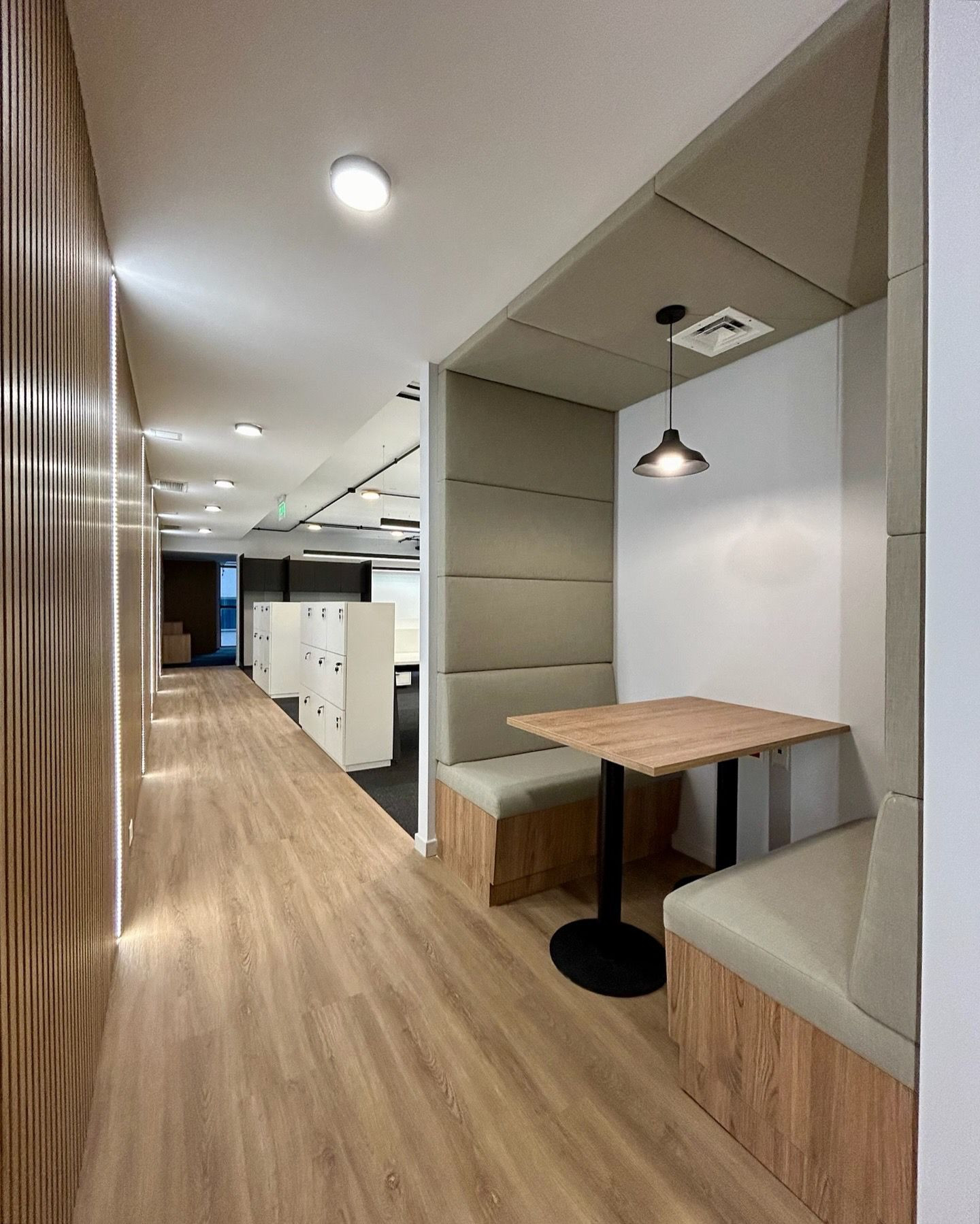 En 120 m2 pudimos proyectar un espacio de recepción, meeting box, coffee, sala de rack, islas de trabajo 12pax y una sala de reuniones 10pax.