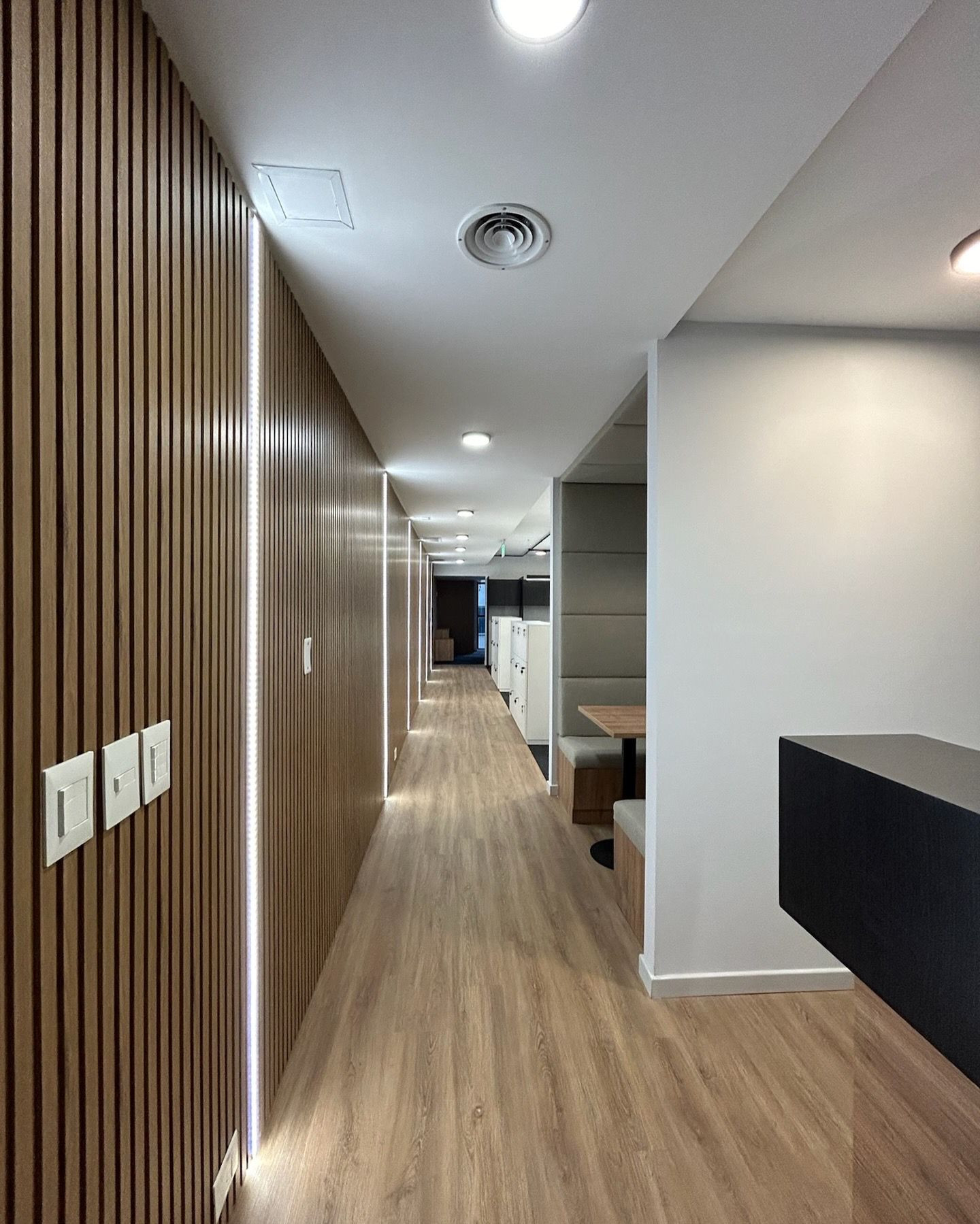 Dándole un acento a la verticalidad, el revestimiento en listones de madera color roble, envuelve la circulación de todo el espacio, aportando calidez.