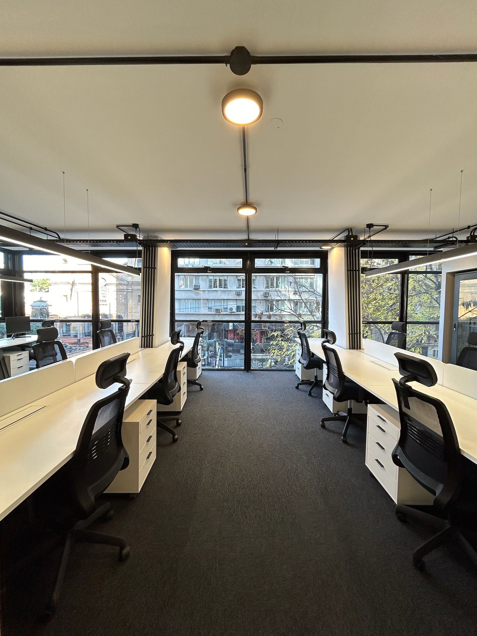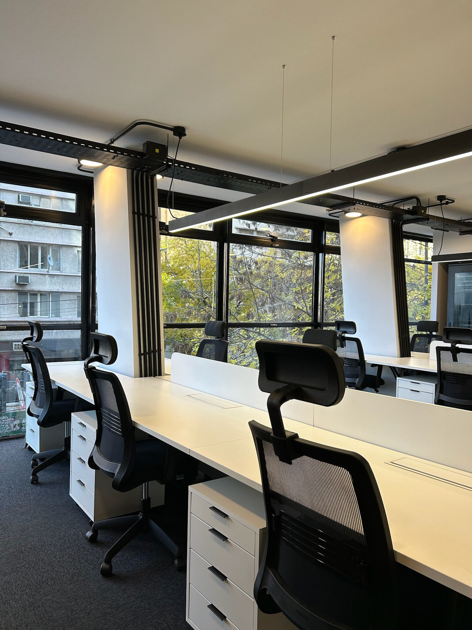 Estos elementos nos inspiraron a trabajar en el interior de estas oficinas, las cuales queríamos que tengan un estilo industrial, con las instalaciones a la vista, planos de trabajo blancos, estructuras y detalles metálicos en color negro reflejando los elementos que componen la fachada.